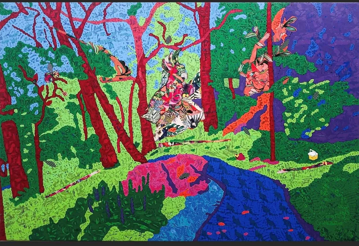 Acrylic paint and fabric collage on canvas